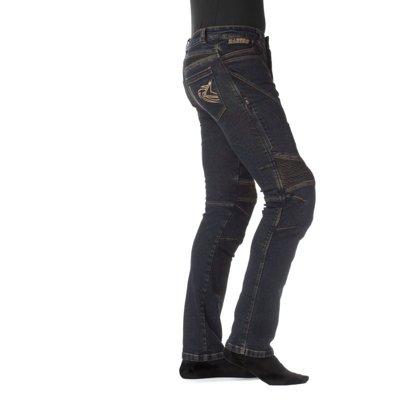 Pantalón vaquero azul oscuro, va equipado con membrana impermeable desmontable mediante cremallera, es un modelo ajustado y de tejido elástico, con dos bolsillos delanteros y dos traseros, estos vaqueros son súper flexibles debido a los fuelles que podrás ver sobre en la zona de la rodilla y la zona lumbar, que es justamente donde necesitamos más flexibilidad, puestos quedan muy juveniles y son muy cómodos, en el interior todos los protectores son de nivel 2 de Memory Foam, los protectores de rodilla, van introducidos en unos bolsillos exteriores de tejido de Kevlar con una solapa de velcro superior para que puedas poner el protector a la altura de la pierna según tu necesidad para proteger tus rodillas, además, también esta forrado en la parte del glúteo con el mismo tipo de tejido (Kevlar). Por supuesto, el vaquero lleva sus correspondientes trabillas para que puedas utilizar cinturón si lo deseas.